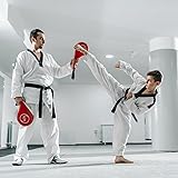 - The Juvale Taekwondo Kick Pads are a crucial part of any martial arts training regimen, designed for disciplines such as Taekwondo, Karate, and Kickboxing. This set includes two red, double-sided kicking pads, constructed from durable PU material to withstand rigorous use. As the cooler months approach, these kick pads are ideal for indoor training, allowing practitioners to refine their techniques regardless of the weather outside. These kick pads are primarily used by adults aiming to enhance their proficiency in martial arts. They accommodate various kicking techniques, from low to high kicks, and are suitable for use in Taekwondo and Karate. The built-in impact boards provide auditory feedback upon contact, which assists in improving precision and timing crucial for disciplines such as Kickboxing and Mixed Martial Arts. Designed with user comfort in mind, these Taekwondo kicking pads feature wrist straps for a secure grip, minimizing slippage during intense training sessions. Measuring 15 x 2.5 x 7.5 inches, they are optimally sized for practitioners of all skill levels, whether beginners or seasoned martial artists. These karate kick pads are versatile, suitable for both home practice and formal training environments. Care should be taken to store these kick pads away from fire, due to their flammable nature. The set includes two pads, focusing on delivering an effective training experience. The Juvale Taekwondo Kick Pads are a valuable addition to any martial artist's gear, perfect for those looking to improve their skills with reliable and durable equipment. These kick pads are compatible with a range of martial arts accessories, enhancing any training session's effectiveness.