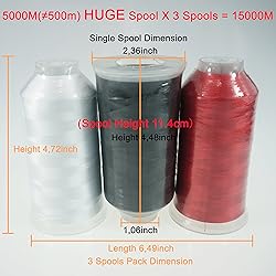 ★★★VALUE PACK - 3 HUGE SPOOLS 5000M (≠500m, total is 15000M) Polyester Embroidery Machine Thread into one pack, SHOCKING PRICE of 3 Spools - You pay for 1 PACK, and you get 3 SPOOLS! ★★ Color Fast, High Strength and Exceptional Lustre, all these Excellent Characters are based on the material of our embroidery machine thread:100% Polyester!!! ★★ Ideal Weight and HUGE SPOOL - Each Spool has 40 W.T.(120D/2) and 5000M(5500Y) length, which makes these spools of Polyester Embroidery Machine Thread ideal for All Embroidery Machines including Home based, Semi-industrial, Industrial and Commercial Embroidery Machines. These Packs surely are the most Economical Choices for Common Used Colors and Multi-heads Machines.(Note: home based machine user MUST use thread stand(holder) to help feeding threads to machine properly!) ★★ The suggested average speed of our polyester embroidery machine thread is 800 stitches per minute for all Embroidery Machines, very few colors will have weaker strength because they need to be dyed in the dyeing facility for longer time to get specific colors, you can slow the speed to around 600 stitches per minute if you meet breaking problem. ★ Lots of Color Packed Embroidery Machine Thread can meet your any needs,if you have difficulty to choose exact colors,you can choose differ greens/yellows/blues/purples/browns/grays to ensure you can use anyone immediately and keep the others for future,because you only pay for 1 Spool,but you get 3 Spools,you SAVE your MONEY!!(Most of the colors can convert between compatible with Brother Colors and Madeira colors, please see our color chart to get correct colors for your embroidery projects.)