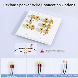 2 gang home theater wall plate can connect 5 speakers and 1 subwoofer; Install audio wall plate in a standard double gang outlet or low voltage bracket for your home theater system; Low-profile Speaker wire wall plate is 4.5 x 4.5 x 0.2 inches; Mounting screws are included Screw type binding post banana plug wall plate with adjustable thumb screws can be used with banana plugs, spade connectors, or bare 12 to 18 AWG speaker wires; 5 speaker wall plate is labeled for the front, rear and center speakers; Binding post terminals on speaker wall plate have red and black ring labels on the front and rear of the 5.1 wall plate for easy identification Subwoofer wall plate with a female coupler can connect an RCA subwoofer cable concealed behind the wall; Install this speaker faceplate in the ideal location at an existing wall plate location or new outlet location for a 5 1 receiver upgrade Three-piece surround sound wall plate 5.1 includes a faceplate and two inserts for a quick installation; Home theater wall plate with gold-plated binding post and RCA connectors provide a reliable connection and distribute authentic audio 5.1 Surround Sound Distribution: This wall plate connects 5 speakers and 1 subwoofer, helping you conceal cables behind the wall for a clean, professional-looking home theater installation.