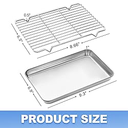 HEALTHY: No more aluminum into your food, great replacement to aluminum pan. The baking sheet is made of pure 18/0 stainless steel and cooling rack is made of pure 18/8 stainless steel without chemical coating or any other materials. 0% Nickel and rust resistant, safe for your daily use HEAVY DUTY: Thick gauge cookie sheet with sturdy construction, the reinforced rolled edge provides extra strength to help prevent twisting and warping, sturdy and durable for long time use. Mirror-finished surface always keep smooth and shiny, rolled edges with no sharp spot on the rimmed toaster oven pans, comfortable to hold and transfer EASY CLEAN: Deep full sides all around prevent food juice from flowing everywhere to keep your oven neat. Both the cookie sheet and baking rack are easy clean up, dishwasher safe to save your labor COOLING RACK: The oven safe baking rack welded firmly with dense parallel lines to keep food from falling through. 4 raised feet for stability and uniform cooling, each wire rack is perfectly fits in the baking pan, that can also be used as a bacon rack for crispy bacon. Food heated evenly and come out perfectly PRODUCT INCLUDES: 2 pieces- Come with 1 baking sheet 9' x 7' x 1', 1 cooling rack 8.5' x 7' x 0.5', perfect to be used as cookie pan or baking tray for your regular oven and toaster oven