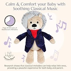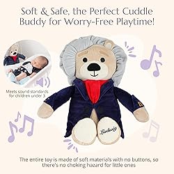 - The Ludwig Van Beethoven Virtuoso Bear is an interactive musical teddy bear that plays 40 minutes of classical music, featuring seven beautifully curated compositions by Ludwig van Beethoven. This soft, huggable musical plush is designed to both comfort and educate, offering a unique experience that helps stimulate cognitive and emotional development in young children. With a simple press of Ludwig's belly, parents can easily control the volume and track selection, ensuring a safe and soothing environment for newborns and toddlers alike.Inside the bear, you'll find a short biography of Beethoven, adding an educational touch to this musical teddy bear. Whether used as a comforting bedtime companion or as an early introduction to classical music, Ludwig is a toy that will captivate your child's imagination and foster a lifelong love of music.Ludwig makes an ideal gift for baby showers, expecting mothers, and special occasions. Its durable, high-quality materials ensure that it withstands endless hugs and adventures, creating cherished memories for both parents and children. As a timeless keepsake, Ludwig is the perfect companion for newborns, toddlers, and beyond