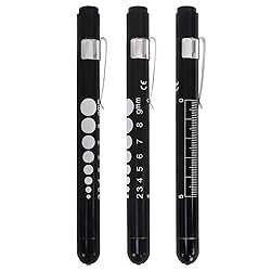 GREAT DESIGN - The design of our pen lights provides a comfortable grip when working and provides a bright light to assist in medical and health assessment. The metal clip beats out other designs with plastic clips, durable and perfect to clip on shirts, pants, or scrubs. READY & REUSABLE - Each kit comes with batteries, allowing you to start working immediately. Replaceable batteries means no more buying disposable pen lights. Light turns on with an easy click of a button. FUNCTIONAL - The white LED light is perfect for a variety of medical uses; everything from examining pupil dilation to checking the soreness of a throat DIAGNOSTIC REFERENCES - Each pen has a pupil gauge and ruler to assist you in diagnostics. FUN COLORS - Each pack comes with two colors: metallic blue & metallic red.