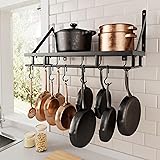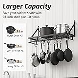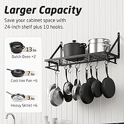 - Features: 24.6 inches x 10.1 inches: Generous size accommodates several pots, pans, skillets, and lids. Frees up more cabinet space in small kitchens. Keeps all cookware within easy reach. 10 Extended Hooks: Lengthened design prevents hooks from falling off during daily use, providing additional hanging storage. Matte Black Finish: Premium surface treatment prevents rust, fingerprints, and daily scratches. Thickened Kitchen Shelves Wall Mounted: Much thicker and sturdier framing than similar options. Sturdy enough to support your heavy cast iron cookware, with a maximum weight capacity of 88 lbs. Smart Structure: Designed to mount on 16-inch spaced studs for enhanced stability. Two Installation Options: Brackets can be installed upwards or downwards to suit DIY preferences. Specifications: -Material: Iron -Finish: Matt Black -Installation Method: Wall Mount Package Includes: 1 x Pot Rack 12 x S-type hooks 1 x Mounting Hardware 1 x Installation Instruction Target Audiences: -Small Kitchen Owners -Home Cooks and Chefs -Home Baker -Organized Homeowners -Handymen and DIYers -Plant Lovers -BBQ Enthusiasts -Gardeners -Interior Designers and Home Organizers -Older people that gets tired of bending down for the pots and pans needed for cooking Ideal Locations for Using This Product: -Small Kitchen Spaces, Above the Stove, Near the Sink -Kitchen Renovations, Kitchen Upgrades -Outdoor Kitchens -Commercial Kitchens -Grilling Areas -Garages and Workshops -Utility Rooms -Home Offices and Craft Rooms Kitchen Styles: Modern Kitchen, Farmhouse Kitchen, Transitional Kitchen, Contemporary Kitchen Q&A: Q1: Is it sturdy enough for heavy pots? A: It can withstand up to 88 pounds, which is sturdy enough to support your heavy cast iron cookware. Q2: Can the hooks be rearranged or removed? A: Yes, the hooks can be rearranged or removed. This allows for customizable storage to accommodate different sizes and shapes of cookware. Q3: Does it save kitchen counter space? A: Yes, it saves kitchen counter space by allowing cookware to be hung on the wall instead of taking up space on countertops. Q4: How much weight can the rack hold? A: The rack is designed to hold up to 88 pounds, ensuring it can withstand the weight of large copper or iron skillets and other cookware. Q5: How easy is installation process? A: It takes less than 10 minutes. Clear Instructions and hardware are included. Q6: Can this rack be used in other rooms? A: Yes, you can install it in areas like the kitchen, garage and basement to store various items. Q7: Is it suitable for small kitchens? A: This pot rack is designed for small kitchens, providing compact storage for cookware. Q8: Is the rack easy to clean and maintain? A: The rack is easy to clean as it can be wiped down.