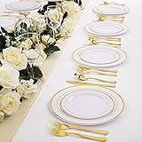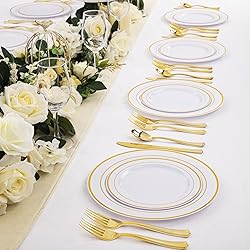 PREMIUM QUALITY: These gold plastic plates setting is safe you and your guests. Solid, durable, heavy duty silverware and thanksgiving plates ensure won't scratch or break easily CLASSY AND ECONOMICAL: Gold rimmed plastic plates disposable include 25 Dinner Plates, 25 Salad Plates, 25 Forks, 25 Knives, 25 Spoons, best for 25persons. Ideal for any events, sturdy construction resists breakage, bending, and snapping. ELEGANT DESIGN: Looks like real china, those gold plastic plates well matched with our elegant gold silverware, Perfect for Thanksgiving,Wedding Receptions,bridal shower, Rehearsal Dinners, Graduations, Anniversaries, Birthday Parties, BBQs, Thanksgiving, and more CONVENIENT TO USE: Add a touch of style to any event without the risk of broken ,Your guests won’t know the difference between these heavy-duty gold plastic utensils and real polished steel ones. CLEAN UP AND SAVE TIME: When the party is over, you can spend more time with family and less time cleaning dirty dishes or keep them and reuse it. So convenient and release your hands