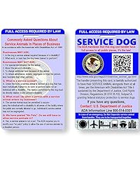HIGH QUALITY: Professionally designed full-color, high definition 30 mil thick PVC plastic information card (Size 2-1/4-inch X 3-1/3 inch) imprinted in full color on both sides with information regarding the regulations and the law, as it relates to service dog access with its disabled handler to all public places. FULL ACCESS: This Service Dog Information Card will reduce conflicts and challenges from uninformed individuals, allowing your service dog to enter restaurants, buildings, hotels, cruise ships, grocery stores, and airplanes as per ADA laws. QR CODE: The QR code scans directly to the ADA website for all Service Dog information. It includes a 5 1/2-inch vinyl luggage loop for easily attaching the card to your Service Dog's harness, leash, or collar.