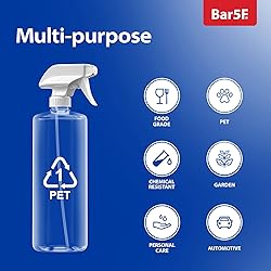 Chemical Compatibility: Use for at home, commercial, or industrial applications; Fill with water or chemical substances containing bleach, vinegar or rubbing alcohol, as it’s compatible with many liquid cleaning solutions Leak Proof: 3-Pack of 32oz empty bottles is made of heavy-duty, impact-resistant, BPA-free plastic; No-leak venting system primes quickly and stays primed; All bottles and sprayers are hand inspected before shipping Endless Uses: Spray away for lawn and gardening, watering plants, succulents, herbs, misting when ironing, laundry stain removal, or car detailing; Make your own DIY pest repellent, cleaners, hair products, or use as a face water mister Smart Design: N7 Sprayer is adjustable for fine to powerful outputs, has a Mixor trigger for peak performance, 10.75” H x 3” W in size, and an ergonomic comfort grip add to its user-friendly convenience and control Trust & Reliability: BAR5F is a leading manufacturer & retailer of plastic packaging in North America and beyond. Our products are designed to meet the modern needs of the personal care, food, healthcare, household, and industrial chemical markets