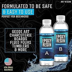 DEPENDABLE QUALITY: Art ‘N Glow’s clear epoxy resin kit is designed to work with our glow in the dark and other craft pigments and inclusions to ensure exceptional results. Easy one to one mix ratio by volume with forgiving 40 minute work time is great for beginners and professionals alike. Stringent quality control at our US warehouse and improved inventory management ensure you get a crystal clear, consistently performing resin every time. FORMULATION PERFECTED: All resin is not created equally. Our epoxy includes expensive additives such as UV stabilizers and HALS to prevent yellowing as well as proprietary bubble release technology to ensure your finished casting or coating are bubble free and clear as glass. Each 16 oz kit includes 8 oz resin and 8 oz hardener to total 16 fl oz. Easy to follow instructions included. SAFE AND DURABLE: Looking for a fun DIY home improvement or art project? Our resin hardens to 80+ Shore D, is food safe, self leveling, low odor, and VOC free. This makes it perfect for use as a table top epoxy, epoxy for tumblers, or to create beautiful serving trays. These characteristics also make it great for woodworking and wood stabilization, furniture, and mixed media. FLUID ART, CASTINGS, AND MORE: Since our resin was designed to excel in both casting AND coating applications, it is perfect for a variety of projects. Create beautiful fluid pours, seal canvas paintings, and coat bars and countertops. Use silicone resin molds to craft resin jewelry, coasters, trays, containers, dice, figurines, and more! Recommended max casting size is 6 fluid ounces but there is no limit for coating applications. U.S. SMALL BUSINESS – Based in Dallas, TX with nearly 10 years of experience and over 100,000 resin kits sold. Our U.S. team provides knowledgeable support to help you succeed with your resin projects.