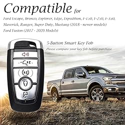 Compatible for Ford Escape, Bronco, Explorer, Edge, Expedition, F-150, F-250, F-350, Maverick, Ranger, Super Duty, Mustang, Fusion with 5-button smart key fob (Note: Only for Push Button Start). Please compare the picture with your key fob before purchase. Handcrafted from 100% premium cowhide leather for a soft, elegant feel that develops a rich patina over time, elevating your new key's style. Delivers 360-degree protection against daily scratches, drops, and wear, keeping your smart key fob pristine and functional for years. Precision-engineered cutouts ensure effortless operation of all buttons, ports, and sensors. All buttons, ports, sensors remain unrestricted without compromising on protection. This case is designed for everyday use. Tailored Fit for your key fob, instantly improve the appearance of your old or damaged remote key fob. Comes with a matching key chain clip for easy attachment to bags or belts. Everything you need for immediate protection Package Included: 1 X Leather Key Case, and 1 X Key Chain Clip. (Note: Key Fob not included)