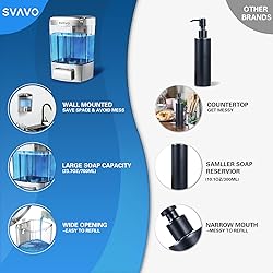 🎃✔ [QUALITY MANUAL SOAP DISPENSER] SVAVO's liquid soap dispenser is made of durable ABS, resistant to chemicals and impact, sturdy and durable, does not rust, providing long-lasting strength with simple and precise push button dispensing. 🎃✔[ANTI-LEAKAGE] Built-in high quality separated outlet liquid nozzle, the dispensing valve of this hand sanitizer dispenser cuts off the soap completely after pumping and prevents dripping, avoiding the pollution for the soap. 🎃 ✔ [SPACE SAVING DESIGN] The hand soap dispenser is created with wall mounted concept that helps save space to dispsense hand soap allodially even in the case of confined space. This wall mount soap dispenser is a hygienic solution to all the clutter of bottles on your shower floor, shower shelf, kitchen sink, washing basin. 🎃✔ [HIGH CAPACITY & EASY TO REFILL] The soap dispenser with see-through soap tank has a larger capacity hold of 23.7oz (700ml) detergent, saving you from the hassel of constant refills. Designed with wide opening mouth, it is super fast and convenient for you to refill this commerical soap dispenser with your favorite liquid, soap, sanitizer. 🎃✔ [30 DAYS MONEY BACK OR REPLACEMENT GUARANTEE] Remember to contact our professional after-sale customer service if there is any issue you have with this shower soap dispenser.