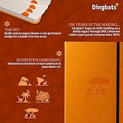 A5 NOTEBOOK WITH LOTS O' FEATURES: Dingbats notebooks ooze quality - this hardcover bound leather notebook is crafted with PU vegan leather, micro-perforated cream 100gsm pages, an elastic closure and pen holder. It's complete with a silhouette of the Safari, an infographic spread about the endangered region in the endsheets and an inner pocket for a little added detail - the perfect gifts for men and women, these travel essentials are a gift that keep on giving HIGHEST-QUALITY WRITING PAPER: This A5 notebook journal (medium, 16 x 21.5 cm) in a flat lay design, is as aesthetic as it is practical. Our size A5 notebook has 192 pages (96 sheets), of the world's highest quality Cream 100gsm, acid-free fountain-friendly dotted paper with the last sixteen pages being perforated. With the index page, numbered pages, keys pages and a future log - it's the perfect recipe, travel, business notepad, or a place to collect your inspirations and thoughts A MULTI-FACETED JOURNAL: Use this stylish notebook as a space to organise your days and thoughts. A cute notebook that can function as both a writing journal and a memo pad, keeping your days on track and your mind in check. No matter what kind of day or week it is, you'll find something to fill the dotted pages of this medium notebook with! This handy sized Dingbats journal notebook is an excellent companion for jotting down your thoughts THE ONLY VEGAN CERTIFIED NOTEBOOK: Made from recyclable materials and purely FSC certified paper, this handsome dotted notebook is 100% Vegan Certified! We wear this badge with honour, and hope you join our pledge to make the environment a better place, one Dingbats pocket notebook at a time! For its UK sales, Dingbats* Notebooks Ltd donates 2% of its revenue to WWF-UK, a charity registered in England and Wales (1081247) A BRAND WITH HISTORY: This hardcover notebook has been handmade with love, by the oldest established paper company in Lebanon (since 1800). We passionately believe that there’s still a place for traditional materials in today’s high speed, digital world. Sometimes you need something that’s more tactile – more personal. The expansive range of Dingbats* Notebooks allows you to choose a design, material and colour that are reflective of your personality