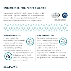 Replacement filter for models with WaterSentry VII filtration system (Coolers + Fountains). Filter should be replaced every 1,500 gallons. Please note, some Elkay filters will ship with a clear cap, instead of a red cap. While colors of filter caps may vary based on inventory levels, there is no effect on filter performance. Equipped with Quick-Disconnect, 1/4 turn installation, as well as automatic inlet shut-off valve that closes when filter is removed. Designed to reduce lead, particles and chlorine. Also reduces odors and discoloration from incoming water. Spun Polypropylene prefilter mesh to prevent large, coarse sediment and particles from entering and clogging filter media. Filter is certified to NSF 42 and 53 for lead, particulate class 1, chlorine, taste and odor reduction.