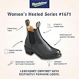 - Blundstone Women's Leather Heeled Chelsea Boots are where rugged durability meets feminine elegance. Designed for modern women who value style and comfort, these boots feature a sleek silhouette complemented by a 5cm Cuban heel, offering a refined lift perfect for any outfit. The premium black water-resistant leather ensures you stay stylish and protected in any weather, while the black elastic side panels add a classic touch and make slipping them on and off a breeze. Engineered for all-day comfort, these boots boast a removable footbed and heel pad that provide superior shock absorption and support, reducing foot fatigue. The cushioned midsole enhances every step, while the steel shank delivers reliable stability. A lightweight, durable outsole ensures long-lasting wear and a responsive feel. Perfect for casual outings, workdays, or evenings out, these boots offer unmatched versatility. Whether paired with jeans, skirts, or dresses, they add a touch of rugged sophistication to any wardrobe.