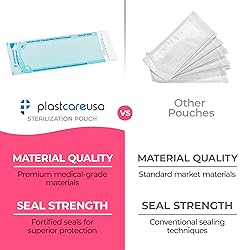 BULK SELF-STERILIZATION BAGS: PlastCare USA provides 1 box of 200 pouches. These sterilizing bags keep teeth cleaning instruments and other dental tools sterilized until their next use. Keep your dental office or lab clean and sterile with these pouches. KEEP TOOLS CLEAN: After instruments have been cleaned, they must be placed in sterile bags or pouches to ensure that they remain sterile until their next use. This is true for nail technicians, dentists, and other medical professionals. Knowing you’re getting clean and sterile instruments is a very calming thought when sitting in the dentist chair. EFFECTIVE CONTROL: These self-sterilization pouches help ensure the safety of staff members and dental patients alike. MAINTAIN ORGANIZATION: Not only do these pouches help with sterilization but they also improve organization. These pouches act as organizers as they keep dental tool kits together so all the instruments are in the same place. Each pouch measures 3.5” by 10" and comes with paper/blue film to hold your supplies. HOW TO USE: Fold perforation back and crease with the protective strip still in place. While wearing gloves, load the clean instruments into the pouch. Do not overfill bag. We recommend filling ¾ full. Make sure instruments don’t pierce package. Expel excess air. Remove strip from adhesive, and fold at perforated line and adhere to both the plastic and the paper to form a tight seal.