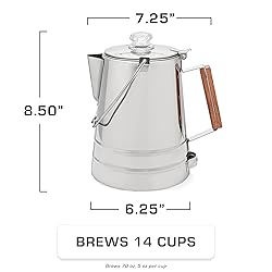 - Experience the nostalgia of percolated coffee with the Coletti Butte 14 CUP Camping Coffee Pot.Coffee Percolators are making a comeback and the Coletti Butte is the very best way to experience this trend! Crafted of solid steel, this pot is designed exclusively for percolating coffee the old-fashion way.Do you like your coffee hot? The boiling water and convection process ensures the hottest cup of coffee possible. The 14 CUP pot helps keep the coffee hot until you drink it.p> The steel handle not only gives this percolator a classic look but allows it to be hung over a fire. 14 CUP Capacity Glass cover knob Dishwasher safe Great for camping Click ‘Add to Cart’ to buy now!
