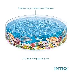 Inflatable pool for kids offers an instant and hassle-free setup, providing fast and cool relief to toddlers from the scorching summer sun within minutes Features a captivating 3-D sea life graphic print on the side of the swimming pool, allowing your little ones to spark their imagination as they play pretend and swim with the fish Made with a durable plastic material that ensures the blow up pool to last season after season, providing a cost-effective summer entertainment solution for your children Includes an easy setup that requires no air inflation, allowing you to maximize the time you spend enjoying the plastic kiddie pool with your children Dimensions of the baby pool measure 8 feet long, 8 feet wide, and 1.5 feet tall with a capacity of 539 gallons, making it ideal for accommodating 4-7 people