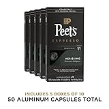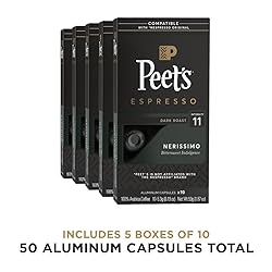 Contains five (5) Boxes of 10 Peet's Nerissimo, French Roast style Espresso - Intensity 11 Dark Roast Coffee Single Cup Espresso Capsules (50 Espresso Capsules Total) Flavor and Roast: Dark Roast - Intensity 11. A bittersweet indulgence in the French Roast style - black as night, sweet as a brûlée topping. 100% Arabica Coffee Peet's Espresso Capsules are compatible with the Nespresso Original Machines*, Essenza Mini, Essenza Plus, Pixie, CitiZ, Lattissima, KitchenAid, and Creatista Nespresso Original machines.* Not compatible with Nespresso Vertuo machines. *Peet's is not affiliated with the Nespresso brand. Recyclable: Peet's aluminum capsules are recyclable through our mail-back program. Each aluminum capsule is sealed to preserve that delicious aroma and flavor for an intense espresso experience How to Brew: Peet's capsules work with Ristretto (0.85 OZ / 25 ml) or Espresso (1.35 OZ / 40 ml) pulls on your brewer.