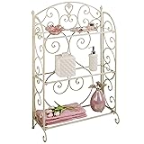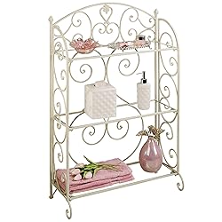 - Grace your bathroom with the traditional styling of the Aldabella Creamy Gold 3-Tier Etagere. Handcrafted, wrought iron etagere not only helps keep things tidy, but will also enhance your decor with elegant, openwork scroll designs and acorn accents. Etagere features scrolled sides and back with a central heart medallion and two acorn finials. The three glass shelves are perfect for displaying your decorative accents. 26 Wx10.5 Dx40 H, 24 lbs. Powder-coat finish with handpainted accents Wrought iron etagere is handcrafted Has three glass shelves for your items.
