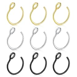 ✿[Hypoallergenic] These fake faux nose rings are made of 316L stainless steel.Nickel-free and lead-free. Could be long time wearing. ✿[Total 9pcs] 9pcs fake septum nose ring : 20 gauge (0.8mm), Inner Size is 5/16" (8mm); could be used as fake septum piercing rings and faux nose ring hoop ✿[Fashion Fake Piercing Jewelry] These fake nose hoops and faux septum rings for women men are simple and elegant for daily jewelry. Easy to open and close. ✿[Using] Surgical steel nose ring can be used as earring hoops, nose rings, lip rings, cartilage earrings, septum rings, nose studs etc