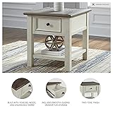 - Bring timeless charm to your living room with the Bolanburg End Table, a perfect blend of farmhouse, shabby chic and country cottage style. Its two-tone finish combines weathered oak with antique white for a warm, inviting look that complements a variety of decor styles. The plank-style top adds rustic character, while black faceted hardware provides a touch of elegance. A smooth-gliding drawer offers convenient storage for remote controls, coasters or small essentials, and the open shelf below is ideal for displaying books or decorative accents. Crafted from veneers, wood and engineered wood, this accent table is both stylish and functional, making it a versatile addition to any space.