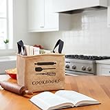Organized Storage: Keep all your recipe books and reading materials together in one convenient location. Durable Construction: Made from a blend of cotton, EVA, linen, polyester, and jute for long-lasting use. Easy to Carry: Handles make it simple to move the storage bin around the kitchen or to another room. Stylish Design: Features a printed design of kitchen utensils and a label with the word "Cookbooks." Protective Interior: Lined interior helps preserve the jackets on books, ensuring they stay in good condition.