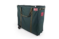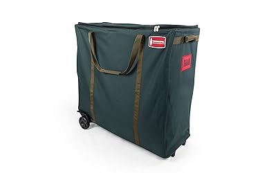 Durable Green Canvas | Wipe-clean Polyester Fabric [STORAGE CAPACITY] - Store wreaths, garlands, and miscellaneous decorations [SEPARATE TOP STORAGE] - Zip-on net above main storage to keep delicate items safe from crushing [DURABLE WHEELS] - Smooth oversized wheel allow you to move around easily [SELF-STANDING STEEL FRAME] - Durable frame to hold heavy trees and still transport the bag easily [CARRY AND MOVE EASILY] - Reinforced padded carrying handles to transport the organized decor around