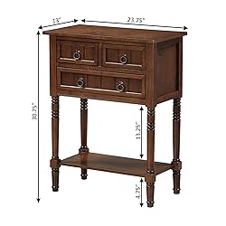 COLLECTION PIECE: Introducing the sleek Kendra Entryway Hall Table - Elevate your home décor with stylish and functional furniture pieces that are perfect for any home decor. BEAUTIFUL DESIGN: This hall table offers a unique design and is available in a variety of beautiful finishes to perfectly complement your classic, farmhouse, traditional, rustic, and transitional-styled home! SPACIOUS SHELVING: With the sleek and spacious tabletop, this entryway hall table offers plenty of room to display home décor and to store entryway essentials in the 3 drawers. A bottom shelf offers additional storage and display space. QUALITY MATERIAL: Crafted from sturdy manufactured wood and solid wood for the rustic sculpted turned legs. Beautifully finished with non-lead-based paint, this timeless design is sure durable and maintenance-free! VERSATILE: This beautiful timeless piece looks great in the family room, living room, entryway, foyer, hallway, office, bedroom, and more! PERFECT SIZE: Perfectly sized to fit any room, this traditional style table measures (L) 23.75 in. x (W) 13 in. x (H) 30.75 in. EASY ASSEMBLY: This flawless sofa display table arrives almost fully assembled with only the legs and bottom shelf needing assembly. No tools needed to assemble making it a hassle-free addition to your home. COLOR VARIATION: Please note that the color may vary slightly due to photography lighting or monitor display. CONTACT US: Contact the brand's Customer Service with all product issues, instructional manual questions, or part requests.