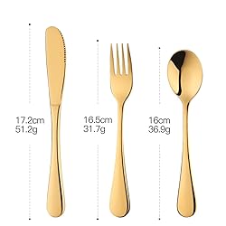 - This mini silverware set is designed according to the characteristics of Student. The size of the cutlery is fit for their hands and mouth. And they are lead-free, BPA-free, cadmium-free and phthalate-free so your toddler can enjoy the success of self feeding, Which is safe for Student of different ages on daily use. And also fit for travel, camping, outdoor dinner, school dormitory, and etc. Besides, colorful flatware sets attract children’s visual interests and increase their appetite. It is perfect for kids gifts and parent’s choice. Feature: Name: Bisda 6 Pieces Flatware Set Blade Material: 18/8 304 Stainless steel Color: Gold, Rose Gold, Blue, Black, Purple and Rainbow as the choices Spoon: 6.3"" L, 1.3 oz in weight Knife: 6.8"" L, 1.8 oz in weight Fork: 6.5"" L, 1.1 oz in weight Size: about 5.90” x 1.55” Dishwasher safe. Package Include: 2 x Knives 2 x Dinner Spoons 2 x Dinner Forks USING INSTRUCTION: 1.Please wash these soup spoons sets with warm soapy water before first using to wash off any processing residue left from manufacturing. 2.Please use a neutral detergent to wash the silverware set after using and dry it before storage for your healthy daily use, and store in dry place. Please feel free to contact us if you have any questions, we’ll do our best to offer help. You can ask questions to us through the “Customer questions & answers” below, and we will contact you as soon as possible. Thank you for your trust in us.