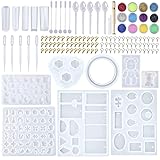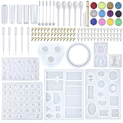 - EuTengHao 229Pcs DIY Jewelry Silicone Casting Molds Tools Set Contains Necklace Pendant Resin Mold Collection, Earring Resin Molds Collection, Diamonds Resin Casting Mold, Bear Resin Mold Bracelet Resin Mold for Jewelry DIY Making Home DecorationPackage Includes:8 x jewelry resin casting mold collection (assorted styles): 3 x necklace jewelry pendant resin molds collection, 1 x earring resin mold collection, 1 x bracelet resin mold, 1 x diamond resin mold 5 x different shape pendant resin molds and 2 x bear pendant resin molds.5 x plastic stirrers5 x plastic droppers5 x plastic spoons5 x different shape pendant resin molds 1 x hand twist drill (include 2 pieces twist bits)100 x screw golden eye pins100 x screw silver eye pins.The kit can be applied to DIY different handicrafts and jewelry, such as keychains, earrings, necklaces, pendants,bracelets, etc., so that you can makespecial gifts for friends or family to show your love.Using various tools to help you make crafts more easily. Metal twist drills can beeasily drilled. Plastic stirrers can stir glue. Plastic spoons allow you toeasily fill powders. Plastic droppers can help you with liquids. Wide applicationAgood choice for DIY handicrafts for key chain, pendant,necklace, it will be aspecial and meaningful gift for your family and friendsHow to cleanPlease clean the resin casting molds with rubbing alcohol, and use soft cloth to wipeclean.How to storePlease store the resin jewelry molds away from direct sunlight and dust.