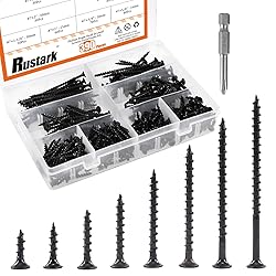 - Rustark Drywall Screws Phillips Bugle Head Self Tapping Wood Screws Assortment Kit Specifications: ★Material : Black Carbon Steel ★Quantity: 390-pcs ★Color: Black ★Drive Type: Philips drive ★Head style: Bugle head ★Length includes: #7*5/8''-M4*16mm, #7*3/4''-M4*20mm, #7*1''-M4*25mm, #7*1-1/4''-M4*30mm, #7*1-5/8''-M4*40mm, #7*2''-M4*50mm, #7*2-1/2''-M4*60mm, #7*3''-M4*70mm Main features: --Suitable for installing drywall in your home, office, building or workplace, etc. -- made of high quality black carton steel, surface treated with black oxide, durable and strong, high in strength, non-deforming. --Assortment kit includes 8 different sizes, you can choose the suitable one to meet all your needs. --come with durable transparent box enough to accommodate all screws to prevent losing. --The product have sharp part, please keep away from children. Package includes: 80Pcs................. #7*5/8''-M4*16mm drywall screw 70Pcs................. #7*3/4''-M4*20mm drywall screw 60Pcs........................#7*1''-M4*25mm drywall screw 50Pcs..................#7*1-1/4''-M4*30mm drywall screw 40Pcs................#7*1-5/8''-M4*40mm drywall screw 30Pcs.........................#7*2''-M4*50mm drywall screw 30Pcs.................#7*2-1/2''-M4*60mm drywall screw 30Pcs.........................#7*3''-M4*70mm drywall screw 390Pcs drywall screws, come with durable box. Warning: This product have sharp point, please keep away from kids.