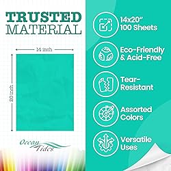 - Elevate your gift presentation with Ocean Tides Premium Wrapping Paper. This collection includes 100 sheets of luxurious, high-quality colored tissue paper that is good for every occasion. Whether you're preparing a gift for a birthday, anniversary, or wedding, or planning a themed party, this wrapping paper adds an extra touch of elegance and charm to your presents. Measuring 14 x 20 inches, each sheet provides ample coverage for any sized gift bag, box, or package. Crafted from durable material, this wrapping paper is not just beautiful but also versatile. Ideal for creating floral arrangements, crafting projects, or custom art, the smooth texture and vibrant color will make your creations stand out. The rich hues add an elegant flair to any display, making it ideal for weddings, Mother's Day celebrations, or even holiday events. Plus, it's gentle enough to use for delicate projects like scrapbooking or crafting, ensuring your ideas are brought to life. With 100 sheets in each pack, you can cover all your gifting and decorating needs. Whether you're wrapping gifts for friends and family, decorating for an event, or adding finishing touches to a flower bouquet, Ocean Tides Premium Wrapping Paper is your go-to choice for a seamless, stylish presentation. The soft and smooth paper will not tear easily, and its vibrant colors will make your gifts the center of attention.