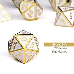 - Product Description Metal Polyhedral Dice Set of 7 Pieces with Metal Tin. Includes D4, D6, D8, D10, D12, D20 and D%. The dice are perfect for RPGs such as Dungeons and Dragons, Shadowrun, Pathfinder, Savage World, Warhammer, Yahtzee, and many other RPG. Specification Material: Zinc Alloy Color:Green with Gold Frame Net Weight: 3.76Oz D4 : 0.19Oz D6 : 0.54Oz D8 : 0.35Oz D10: 0.51Oz D %: 0.52Oz D12: 0.71Oz D20: 0.94Oz Package Include: 1* White & Gold Metal Polyhedral Dice Set 1* Silver Metal Tin Dice Warranty If you receive defective dies or missing dies set, please contact us for replacement. Warm Notice Small parts, please keep them away from children.