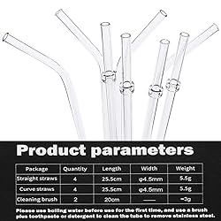 - Durable Healthy Easy to Clean BPA-Free, Environmentally Friendly Can be Used in Hot or Cold Drinks Kids with adult supervision Protect Teeth from Cavities and Stains Affordable, Great replacement straws Dishwasher Easy to Carry with You Everywhere! Lifetime Guaranteed Nice Packaging Great gift choice for your families and friends. Specification: Length: 25.5cm (about 10 inches) Outer Diameter: 6.5mm (about 0.18 inches) Inner Diameter:4.5mm (about 0.18inches) Package Includes: 4x straight straws 4x bent straws 2x brushes cleaning Clear Drinking Straws Some Tips: Please use boiling water before use for the first time, and use a brush cleaning or detergent to clean the tube to remove Teach your child not to bite down on the straw as it may hurt their teeth or mouth.