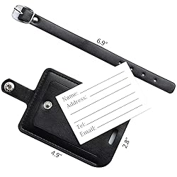 - ✓Leather Luggage Bag Tag & Wonderful Travel gift 2 Pieces PU Leather Luggage Bag Tag Privacy Suitcase Travel Tag Combo Set. Made up of soft PU leather material with reinforced stitches. This luggage tag would make a wonderful gift for a friend or a loved one or treat yourself. ✓Privacy flap to protect your personal information Hidden flap holds ID/business card while protecting your privacy, using UV and water resistant inks for outstanding durability, you can open the flap slightly to look into and make sure this is your stuff, while most of the time your privacy remains safe and sound from other travelers ✓Spot It From A Distance Fashionable and stylish Black luggage tags, you will easily spot your luggage labeled with this eye catching tag in the airport and help you find your own luggage at the first sight from similar luggage. ✓Removable and extended strap With an High Quality Leather adjustable Belt buckle strap for the Travel Tag, Long enough and make it easier to attach the tags. This durable strap is sized to fit all types of luggage, keep your tag secure. ✓Identification Card Included Identification card is protected behind clear vinyl window for the luggage tags, you can write your name, address, contact and so on, which can make it easy to distinguish your luggage case in Airport and protect your luggage case from being picked up by mistake. Product parameters: - Quantity: 2 Pieces Set - Window: clear plastic shield - Net Weight: 1.02oz/29g - Tag: Polyurethane Leather Luggage tag / 4.9" X 2.8" X 0.18" Product Size - Adjustable strap: Pull strap is 6.9"/17.5cm long / 304 stainless steel buckle Promise To You:In case you are not satisfied with our leather Luggage tag, You can send an Amazon email to us for free replacement or offer you full refund.