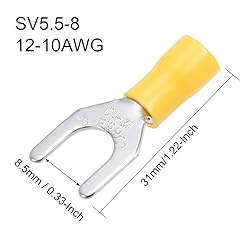 - Descriptions: Durable insulated crimp terminals. Easy to connect with electrical wire and strengthen its reliability. Widely applied in electric and electronic industry, electric equipment, Industrial automation, street lighting and power control system in traffic and transportation, posts and telecommunication, petrol chemical industry, industrial building machine-building, etc. Specifications: Model: SV5.5-8 Material: Copper Main Color: Yellow Total length: 31mm/1.22-Inch Fit Cable Size: 12-10AWG Bolt Mouth Size: 8.5mm / 0.33-Inch Maximum Output Current: 48A Net Weight: 393g Package Content: 200(+/-2%)Pcs x Insulated Crimp Terminals