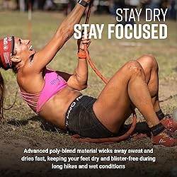 COMFORTABLE AND LIGHTWEIGHT CREW SOCKS: Designed for running, hiking, and cycling adventures; medium cushion footbed and snug-fit collar provide all-day security and eliminate slipping, even during intense workouts; lightweight upper ensures breathable comfort for any activity; made from 95% Polyester, 5% Spandex by experts in performance sock construction. SWEAT-RESISTANT AND BREATHABLE SOCKS: Stay dry no matter the conditions with advanced poly-blend material and ventilated mesh zones; smooth toe seams and anti-chafing design deliver unmatched comfort during extended wear. ANTI-BLISTER AND NON-SLIP DESIGN: Strategically cushioned in key areas for superior support and protection; non-slip heel locks your fit on rugged trails, while arch support boosts performance and reduces fatigue; built tough for any challenge. QUICK-DRYING AND ODOR-RESISTANT SOCKS: Tackle muddy trails and wet conditions with confidence; these socks drain fast and resist odors to keep you fresh, even through ultra-marathons and obstacle races. DURABLE, HIGH-PERFORMANCE SOCKS GUARANTEED: Proudly made in the USA and backed by a lifetime warranty; tested in extreme conditions by top racers and athletes since 2012; 100% satisfaction guaranteed.