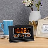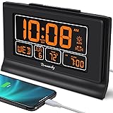 Large Display with Full Range Dimmer: 5 inches Large LCD screen with nice eye care number display. Time, date and temperature display. Almost full range brightness settable (6 levels + auto dim ), you can easily change to have the view bright or dim it to extremely low. Advance autoset time: The alarm clock will set itself to right time, date and temperature immediately once plugged in. The long lasting button cell backup battery (installed ) will holds all settings and ensure the time always be accurate in case of main power interrupted. What you need to do is set your time zone and wake up time. Simple as that. Even miss the right time, you are still able to set it manually. Auto DST and selectable time zone: Automatically adjusts to Daylight Savings Time while set the DST on. Seven USA time zone (EST/ CST/ MST/ PST/AST/HAT/AKT) and one newfoundland time zone NST selectable for your location. Ascending beeping alarm with snooze: Ascending alarm sound wake you up naturally. Additional snooze to counter oversleeping, simply press the snooze button once and go back to sleep. 8 minutes later the alarm will ring again. Plug in clock with USB charging port: Powered by USB port by plug in outlet. Extra USB charging port for charging cellphone and other electronic device. 3 x AAA batteries( not included) as backup, which will store the setting and keep the time works in case of main power outage.