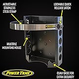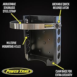 COMPACT DIMENSIONS: With measurements of just 4.947" x 9.125" x 11", this propane tank bracket offers a space-saving solution for securely transporting your tank, ensuring it fits snugly in your vehicle or storage area without occupying excessive space. DURABLE POWDER-COATED FRAME: This propane mount, featuring a corrosion-resistant satin black powder-coated aluminum frame, ensures long-lasting durability. Rubber trim and bumpers at key contact points safeguard your tank against scratches and abrasions, enhancing protection during transport. SECURE STAINLESS STEEL STRAP: Equipped with a stainless steel strap and hardware featuring an adjustable quick-release locking latch and multiple strap mounting points to allow for short and tall bottles from various propane tank manufacturers. Secure transport and storage with added convenience of easy removal. COMPATIBLE WITH VEHICLE MOUNTS: This propane tank bracket is compatible with various Power Tank vehicle mounts including Roll Bar Clamps, Ladder Mounts, MOLLE Power Plate, Wrangler, Jeep, and Toyota, offering versatile mounting options for your convenience. PERFECT FIT FOR 9” DIAMETER CYLINDERS: Specifically engineered to accommodate 9" diameter propane cylinders, this bracket provides a precise and secure fit for your propane tank, preventing unnecessary movement or rattling during transport. The added “foot-grip” design grabs the base for added security on the roughest trails.