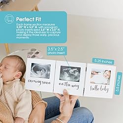 - Display pregnancy milestones with the Pearhead Triple Sonogram Keepsake Photo Frame. Designed to hold three photos, this hinged wooden frame allows parents to showcase ultrasound images and early baby photos in one coordinated display. The frame features three panels with printed milestone phrases reading “coming soon,” “on the way,” and “hello baby,” accented with subtle gold heart details. The white finish and clean design coordinate with a wide range of nursery décor styles and home interiors. Each panel holds a 3.5 x 2.5 inch photo, and the hinged construction allows the frame to stand independently on desks, shelves, or tabletops. Suitable for pregnancy announcements, baby showers, or nursery décor, this ultrasound photo frame provides a simple way to document and display early milestones. Each frame block measures 5.25 x 5.5 inches.