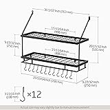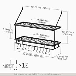 - Our kitchen storage rack is a fashionable and convenient option for creating space in even the tiniest of kitchens. With simple installation, an instructions manual, and mounting supplies, you'll have everything you need to have the rack up in no time at all.A sturdy grid shelf and 12 detachable hooks will make kitchen organization easier than ever so you can enjoy stress-free cooking and extra counter space! INCLUDED WITH PURCHASE:1 x Kitchen Pot Rack12 x S-type hooks1 x Mounting Hardware1 x Installation Instruction PRODUCT SPECIFICATIONS:Material: IronFinish: Matt BlackInstallation Method: Wall MountMax. Load: 55 lbs, screw-mounted on solid concrete wall