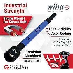 - Wiha 6 Piece SAE Color Coded Impact Nut Setters Items In Set Wiha 70480 - Color Coded Magnetic Nut Setter 1/4" (OAL ″) Wiha 70481 - Color Coded Magnetic Nut Setter 5/16" (OAL ″) Wiha 70482 - Color Coded Magnetic Nut Setter 3/8" (OAL ″) Wiha 70483 - Color Coded Magnetic Nut Setter 7/16" (OAL ″) Wiha 70484 - Color Coded Magnetic Nut Setter 1/2" (OAL ″) Wiha 70485 - Color Coded Magnetic Nut Setter 9/16" (OAL ″) More Details Wiha's Color Coded Nut Setters are designed with high-visibility color-coding and laser-engraved size callouts for quick and easy identification. The nut setters have a solid shaft to provide strength and durability for long-lasting repetitive use and are impact-rated for use in power tools. The nut setters feature industrial-strength magnets that securely retain fasteners to give you the freedom of one-handed work applications. Wiha Color-Coded Magnetic Nut Setters have a standard 1/4-inch hex drive and a 6-inch overall length, making it easy to work in limited access environments. The set includes standard SAE sizes: (1/4, 5/16, 3/8, 7/16, 1/2, 9/16-inch) for a wide variety of applications. Consisting of premium quality CrMo tool steel, the nut setters are precision-formed for exact-fit, and have a durable finish for corrosion protection. The socket openings feature a beveled rim for easy fastener engagement with a broached and smooth finish for prolonged life. Wiha Color Coded Magnetic Nut Setters are designed and engineered by Wiha Germany and manufactured by Wiha globally. Cold forged from Chromium-molybdenum alloy steel (CrMo) for strength and durability High-visibility color coding for quick and easy size identification Industrial strength magnetic tip for secure fastener hold Impacted rated to 700 in/lbs for maximum performance with Li-ion impact drivers Exact fit precision machined tip for reduced cam-out Standard 1/4-inch hex drive for universal application 6-inch (152mm) overall length for extended reach Radiused corners for preventing fastener head round-off Durable black oxide finish for corrosion protection Broached and clear-coated openings for added corrosion protection Designed and engineered by Wiha Germany Manufactured by Wiha globally