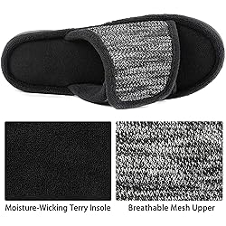 - Discover everyday comfort with RockDove Men’s Adjustable Wrap Memory Foam Slide Slippers, designed as breathable men’s slide slippers / house sandals for home and beyond. The open toe breathable style promotes airflow to keep feet cool and fresh, while the adjustable hook-and-loop wrap upper delivers a customized fit for wide feet, high instep, swollen feet, and sensitive feet, helping reduce rubbing and tightness. Underfoot, the high-density memory foam cushioned footbed molds to your foot shape for cloud-like support and pressure relief during walking, standing, or relaxing. A soft, moisture-wicking terry cloth lining keeps feet dry and cozy, and the slippers are machine washable for easy care. Finished with a durable non slip rubber sole, these indoor outdoor slippers provide reliable traction on tile, hardwood, carpet, and even wet surfaces—perfect as men’s house shoes, slip on sandals, or everyday indoor/outdoor slides for home, dorm, office, travel, and quick errands.