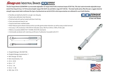 ✔️CDI Torque Products A Snap-On Company Products are Proudly made in the United States of America, City of Industry, California. Each tool comes with a Certificate of Calibration and custom molded storage case. ✔️CDI Torque Products A Snap-On Company - The CDI Torque Wrench A Snap-On Company is a micrometer adjustable 1/2" torque wrench with a maximum torque of 250 ft lbs. This dual-scale micrometer adjustable torque wrench from CDI Torque Products A Snap-On Company has a 1/2" Drive and an English range of 30-250 Ft Lbs and Metric range of 47-332 Nm. ✔️CDI Torque Products A Snap-On Company Handles are lightly knurled for a tough, non-slip grip. Dual scale, calibrated dual direction, Positive lock with spring loaded pull down lock ring. Accuracy: ± 3% clockwise ± 4% CCW of indicated value, CW, from 20% to 100% of full scale. ✔️CDI Torque Products A Snap-On Company Fast, accurate and easy to set, Easy-to-read laser marked scales, Most feature quick release buttons which provide good socket retention as well as easy socket removal. Meets or exceeds ASME B107.14-2004, ISO 6789 standards, Individually serialized with matching certificate of calibration traceable to N.I.S.T. ✔️CDI Torque Products A Snap-On Company The metal handle series offers the user a rugged, industrial strength torque wrench able to withstand the rigors of professional use and all of CDI's click torque wrenches are calibrated for use in both direction