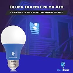 - Replace that boring white light with a Bluex Bulbs LED Blue Color A19 Bulb instead. Emitting a pure blue light, this bulb will add a beautiful touch of color to any indoor or outdoor setting. It’s the perfect choice when decorating for a party, holiday or special occasion, creating a soothing yet charming glow that’s sure to impress your guests.Each low, 9-wattage bulb (60-watt equivalent) emits an 850-lumen blue light, yet uses less energy and endures for longer periods of time. Not only will you see a reduction in your electric bill, but you also won’t have to deal with replacing these bulbs for many years.Blue light is known to help reduce stress, creating the perfect atmosphere in your bedroom or den. It’s also a great option for use as a nightlight or to keep a hallway lit in case you wake up in the middle of the night. Unlike other blue bulbs on the market, this one features an feature. Modify the brightness at your heart’s content to suit your mood, produce the perfect ambiance or provide the right amount of illumination you need.Furthermore, LED bulbs are a safer alternative. They are free of harmful mercury and won't release any hazardous gases, creating a healthy environment for you and your family. Plus, there’s no need to worry if a bulb breaks or about having to recycle it.Furnished with a standard e26 base, the LED Blue Color A19 Bulb will fit most lighting fixtures so you can transform virtually any room into a relaxing blue hue. Plus, the bulbs are sold in a 2-count package to provide you with twice as much fun! Each bulb can last up to 10,000 hours, providing you with decorative lighting and relaxing nights for years to come.
