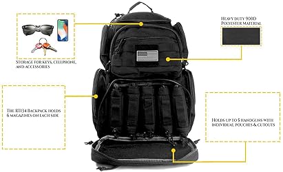 Tactical Range Backpack Has 5 Individual handgun pouches for transporting your pistols to the gun range. The pouches are 10x7x2 and have extra padding to protect your pistol. FREE U.S. flag patch included! Heavy Duty Army Molle Rucksack is made of 900D water resistant polyester material. Curved adjustable back straps with padded back support for comfort. Thick heavy duty zippers ear muff & cell phone pocket and plenty of space Lockable Rugged Range Backpacks has tons of storage for your gun accessories, 10 compartments for storage and 12 total handgun mag holders. There are Double lockable zippers for added security. Keep yourself organized for the range or outdoors Quality Multi-Functional Gear Backpack provides extreme comfort and organization. Equipped with a rain cover, The rugged materials allow you to take your pack with you Hunting, outdoor hiking,camping and travel. UPDATED DESIGN (May 2019): We've heard your concerns and made some upgrades in the material! Threading durability has been improved for the new model.