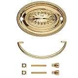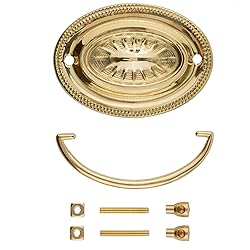 Dimensions: 3" Centers; 2 3/4" High x 3 3/4" Wide - Backplate Size. This drawer pull is made of stamped brass. The package contains one bail, one backplate and two eyebolts with nuts. This Hepplewhite bail pull is easy to install and gives a traditional look to your furniture piece. It perfectly complements an antique dresser, cabinet, armoire, bedside table, desk, chest, and more. Our handles are a nice feature for completing an antique restoration or woodworking project. Using these pulls on kitchen or bedroom furniture can also add a vintage touch to modern home decor.