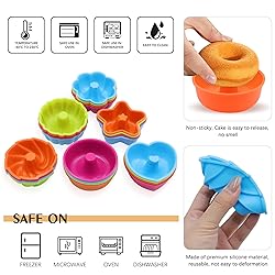 Food Grade Silicone - Food grade silicone, so flexible. Includes six styles, each design in four different colors. It is the mini small size, measure 2 3/4 inches in diameter or so. Non-stick and Heat-Resistant - The doughnuts pan are non-stick, keep their shape well. Cooled items pop out easily without cracking or breaking apart. Temperature safe from -40 to +446℉/ (-40 to +230℃), Oven-Microwave-Freezer-Dishwasher Safe. Multipurpose Versatility - Can make individual donuts, muffins, snack cakes and breakfast items. You could fill the center hole with whipped cream and put a strawberry on top. Also good for small frozen treats , jello, ice cubes, mousse or soap molds too. Easy to Use - Simply place the cup on the cookie sheet, fill and bake . Or place them directly on a regular cookie sheet. Great for occasions of birthday party, holiday party, baby shower, or wedding, they will be a big hit with your guests. Easy to Clean- Inside bright finishing, it is easy to clean and separate with cake. After using, soak baking cups in warm soapy water. Any leftover crumbs will turn into mush and can easily be washed out with a soft cloth.