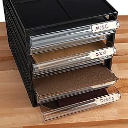 - This WoodRiver Sandpaper Organizer is the perfect solutionfor the “lost sandpaper” dilemma: Six drawers measuring 9-1/4" x12-1/2" x 1" in size will keep all your sandpaper neatly organizedand will hold all sizes of sandpaper, even those large 9" x 11"sheets. So load up on sandpaper!The organizer’s design features tabs built into the rear ofthe drawers to prevent drawers sliding out or being pulled out, and say goodbyeto mixed-up paper – our organizer comes with the 6 sticker tags for markinggrit locations. A black plastic frame protects the WoodRiver SandpaperOrganizer drawers from any accidental damage that might occur from dropping orbanging. About Us: Founded in Boston in 1928, Woodcraft's operations were moved to Parkersburg, West Virginia in 1989. It's been over 90 years since Woodcraft first began selling high quality woodworking tools and supplies out of a one room shop in Boston's North End, and Woodcraft is still firmly committed to providing woodworkers with superior products and expert advice. We are America’s leading supplier of saws, hand planes, power tools, hand tools, wood stain and finishes, routers, sanding supplies, wood, wood turning project kits, dust collection, and wood carving tools. We also offer a wide selection of woodworking plans, books and videos. Our family of brands includes WoodRiver, Highpoint, Woodcraft, Pinnacle and Woodcraft Magazine.