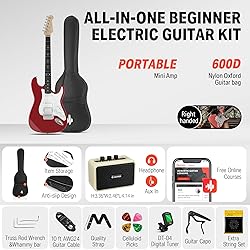 [H-S-S pickups] Donner electric guitar has two classic Single-coil pickups and one power 203S Humbucker pickup. 5 ways pickup switches and 2-tone & Volume controls for choosing. Suitable for both beginners and professionals. H-S-S pickups are not just perfect for a Texas blues/rock sound, but for other musical styles too [Canadian maple neck with “C”shaped profile] Donner DST-100 beginner electric guitar bundle uses purpleheart wood fingerboard, poplar solid body, Canadian maple neck with “C” shaped profile, classic design, comfortable fit [22 copper-nickel frets] The 39-inch electric guitar features a pick up selector switch, a volume knob, and two different tone knobs. 22 copper-nickel frets with fret position marks on the neck and top of the fingerboard, and also is smooth and friendly to your hands [All-in-one beginner package] Donner electric guitar set comes with a portable amplifier, 600D quality bag, capo, strap, extra string, digital tuner, amp cable, and picks. Also with online lessons, you can play guitar immediately when you receive them [Portable guitar MINI amplifier] The amp comes with an amp cord and has two-tone channels. Easy Control & Little Size & Tube Sound.1/8" auxiliary input jack for jam-along with media player or CD, 1/8" headphone output jack for silent practice