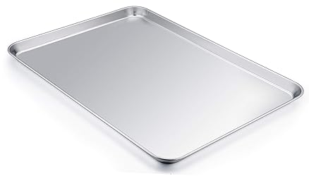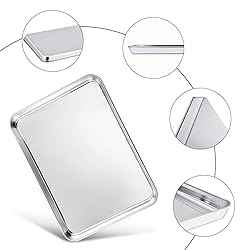 HALF SIZE - Half sheet pan set of 2, both 19.6’’×13.75’’×1.3’’, Xlarge and sufficient for the amount of the whole family, 2 pieces ideal for taking turns to bake, Save your time without waiting cooling to exchange NON TOXIC - TeamFar baking sheet set is made of premium stainless steel, Without other substances or chemical coating, Rust free and healthy for daily baking HEAVY DUTY & THICK - Our stainless steel cookie sheets are heavy duty with thick and solid construction, Solid for professional roasting, Sturdy for long serving time CRAFTED - Superior mirror finish of the baking pans for food less sticking and easy releasing, Smooth roll edges and round corners comfortable to take and transfer DISHWASHER SAFE - Deep full sides and rimmed baking sheet prevents oil from spilling to keep your oven neat, Smooth surface helps cleaning a breeze, Dishwasher safe to save your labor