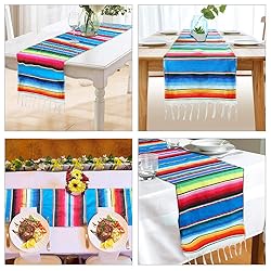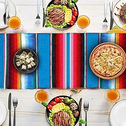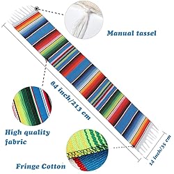 - Mexican table runner is the perfect party decoration with a classic Mexican-style stripe pattern and vivid psychedelic colors. Mexican serape table runner suitable for mexican themed party, Fiesta or Cinco de Mayo celebration, birthday party, wedding. Mexican party table runner ideal for table cloth, curtains, blanket, wall decoration, outdoor table, picnic rugs and just anything you must cover, bring a beautiful and festive feel to your dining area. Mexican table runner is hand woven, made of high quality cotton and tassel, easy to clean, stain resistant. It is sewn on all four sides, not easily loose thread. Specifications: Package Included: 1 pcs Mexican table runners Size: 14inch x 84inch / 35cm x 213cm Weight: 200g Color: Blue Material: Made of high quality cotton and tassel Care instructions: Hand wash and hang dry